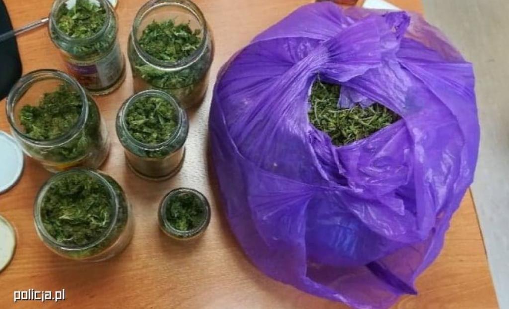 Zielony susz roślinny - marihuana zabezpieczona przez policjantów, znajdująca się w słoikach i fioletowym worku