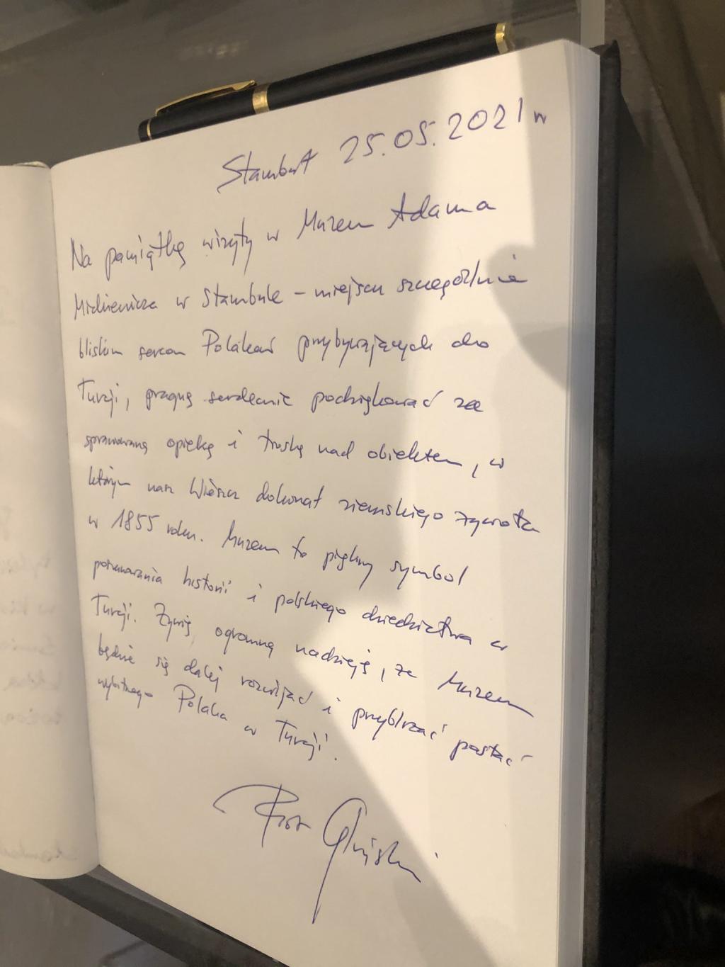 Muzeum Adama Mickiewicza to piękny symbol poszanowania historii i polskiego dziedzictwa w Turcji. Żywię ogromną nadzieję, że Muzeum będzie się dalej rozwijać i przybliżać postać wybitnego Polaka w Turcji – napisał w księdze pamiątkowej muzeum wicepremier, minister kultury, dziedzictwa narodowego i sportu, prof. Piotr Gliński.