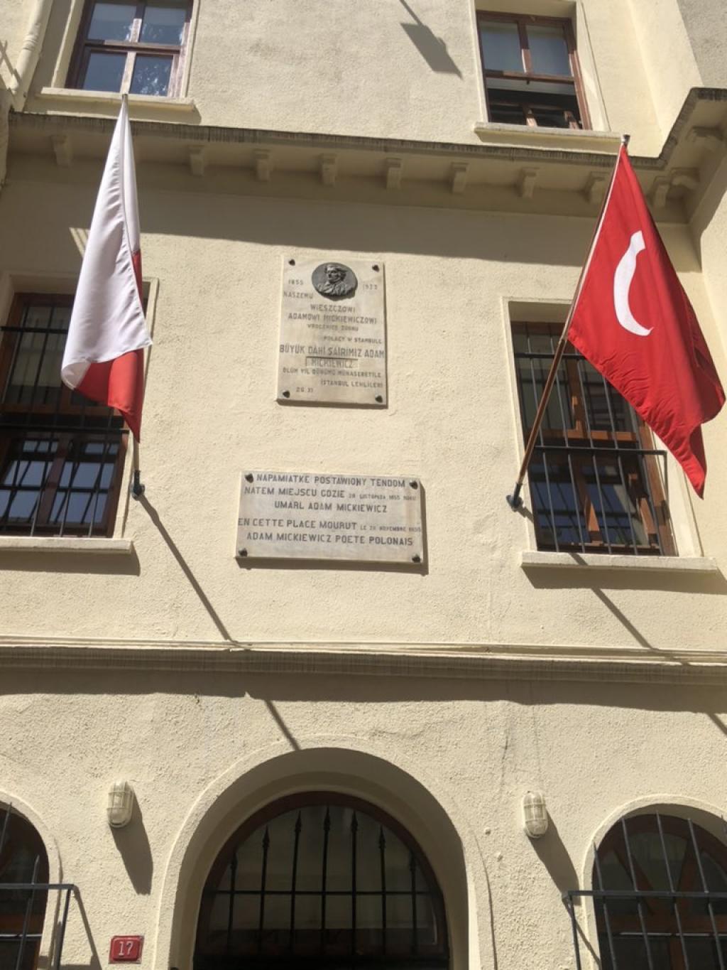Dom, w którym mieszkał i zmarł Adam Mickiewicz, był po śmierci poety odwiedzany przez wielu Polaków. Drewniana górna część budynku spłonęła w pożarze Stambułu w 1870 r. Po odbudowie dzielnicy (ze zmienioną siatką ulic) zrekonstruował ją z wielkim pietyzmem żołnierz powstania listopadowego Jan Górczyński. Stała się miejscem spotkań polskich emigrantów. W 1909 r. w fasadę budynku wmurowano pierwszą, niezachowaną dziś tablicę z napisem: Poeta i wielki patriota polski Adam Mickiewicz, przyjaciel Turków, ufundowaną przez Turecki Komitet Jedności i Postępu. Kolejną tablicę umieścili w 1933 r. mieszkający w Stambule Polacy.