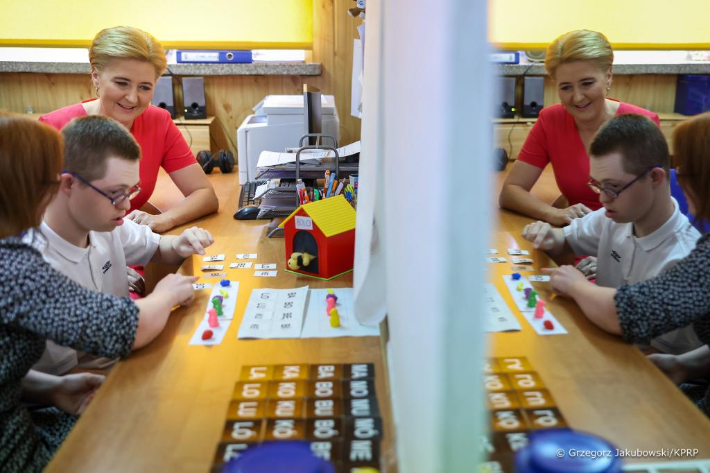 Pierwsza Dama Agata Kornhauser–Duda odwiedziła dziś Zespół Szkół Specjalnych im. ks. Jana Twardowskiego w Grójcu i spotkała się z uczniami oraz nauczycielami placówki. W programie wizyty znalazło się wspólne muzykowanie, rękodzieło, czytanie „Calineczki” Hansa Christiana Andersena i trening sensoryczny – Małżonka Prezydenta miała okazję przyglądać się, a także aktywnie uczestniczyć w zajęciach z bogatej gamy aktywności edukacyjnych i rewalidacyjnych.