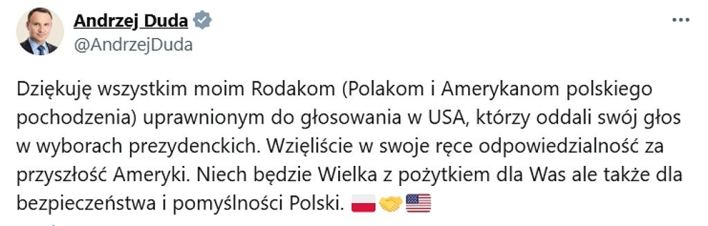 Prezydent RP Andrzej Duda złożył gratulacje kandydatowi Republikanów w wyborach prezydenckich Donaldowi Trumpowi. – Gratulacje, Panie Prezydencie Trump! Zrobiłeś to! – napisał na platformie X Andrzej Duda. Podziękował też Rodakom, Polakom i Amerykanom polskiego pochodzenia, uprawnionym do głosowania w USA, którzy oddali swój głos w wyborach prezydenckich.