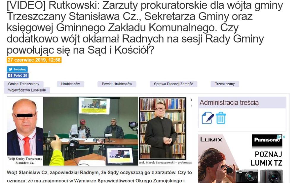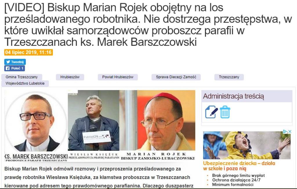 Sekretarz gminy Trzeszczany Paweł L. jest oskarżony o nakłanianie robotnika Wiesława Księżuka do składania fałszywych zeznań. Prześladowany robotnik za tę prawdę wciąż nie może znaleźć pracy. W jego obronie nie stanął ani proboszcz Marek Barszczowski ani biskup zamojsko-lubaczowski Marian Rojek.