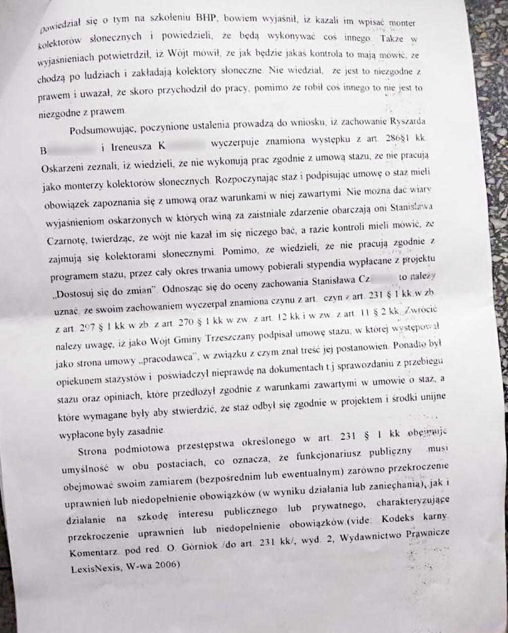 Dotyczy ona Stanisława Cz. z czasów, kiedy prowadził kampanię na rzecz wybrania go na stanowisko wójta w 2014 r. i możliwego jego przestępczego działania, jako ówczesnego gminnego operatora koparki, również na terenie probostwa w Trzeszczanach, za czasów proboszcza Grzegorza Hałasa.