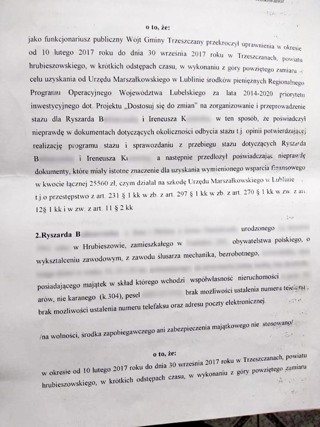 - Wiedzieliśmy, że to się nie zgadza z celem tego stażu. Ale wójt nas zapewniał, żebyśmy się nie martwili, bo on wszystko załatwi - czytamy w akcie oskarżenia relacje obu mężczyzn. Oni również zasiedli wczoraj na ławie oskarżonych Sądu Rejonowego w Hrubieszowie. Prokurator zarzuciła im, że wyłudzili po 12 780 zł każdy.
