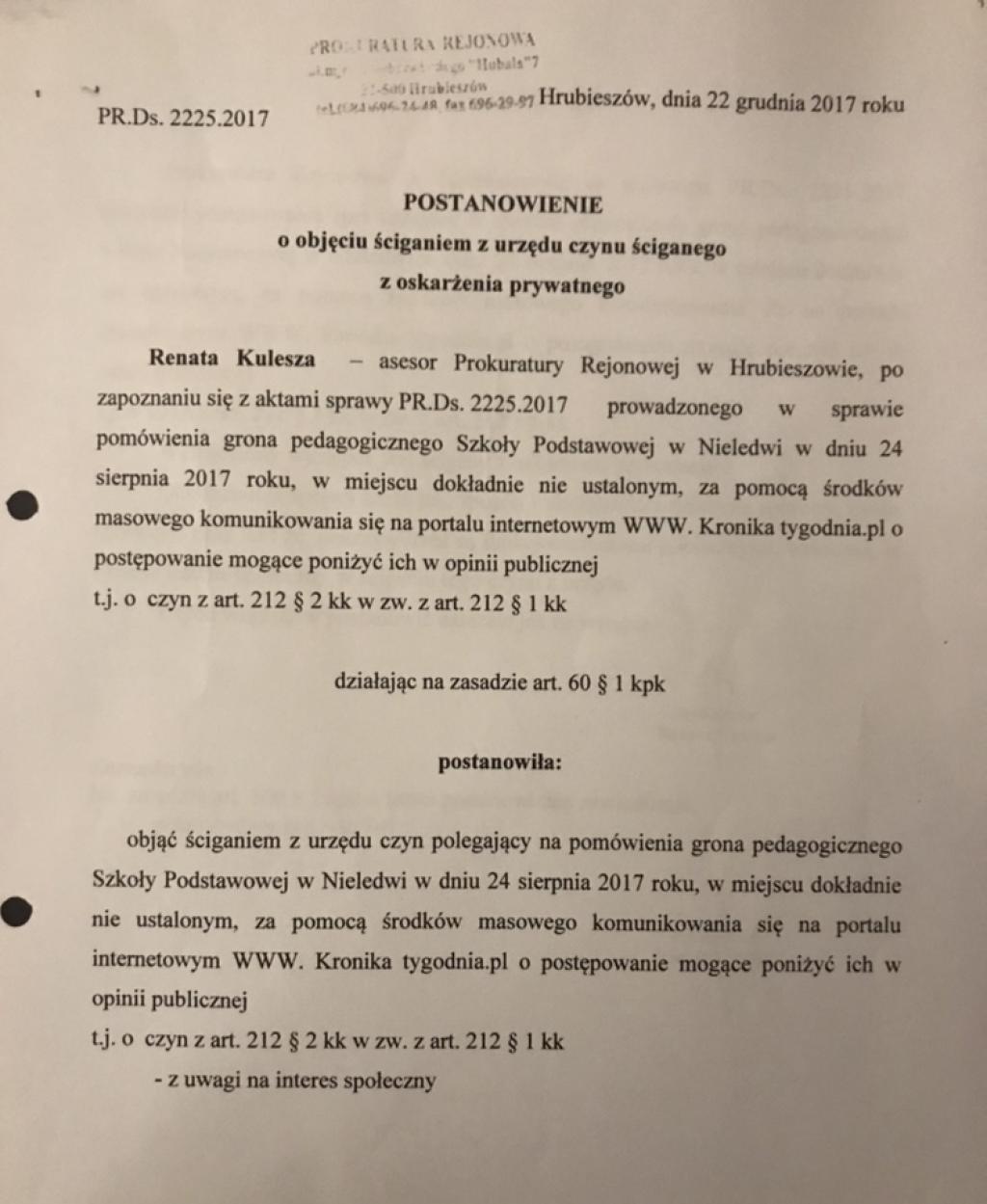 Z dokumentów prokuratorsko-policyjnych wynika też, że to nie pierwsze śledztwo dotyczące oszczerstw na terenie tej gminy. Chodzi o wpis w internecie twierdzący, że nauczyciele gminnej szkoły w Nieledwii to "łapówkarze".