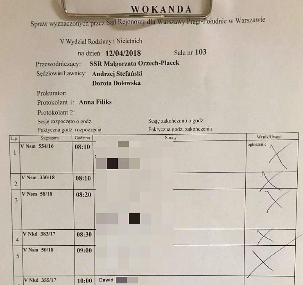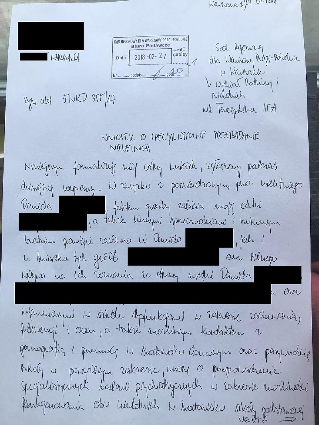 - Ponieważ sędzia odmówiła zaprotokołowania tego wniosku na sali sadowej, 20 minut później złożyłem go do akt sprawy w Biurze Podawczym do sygnatury akt 5 Nkd 355/17 i dziś upubliczniam ten dokument. Dlaczego więc sędzia jako funkcjonariusz zaufania publicznego kłamie? - pyta rodzic